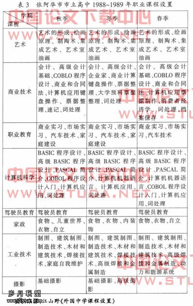 职业课程门类多样化美国的职业与技术课程包括农业、推销、卫生、家政、办公业务、技术、工商业等选修科目,基本上涵盖了职业技术的各个领域。而且每一选修科目下面还包含了一系列具体课程,如商业教育课程有现代经济、实用经济学、财务管理、实业入门、市场原理、市场和广告、应用计算机技术等等,因此,职业课程的门类就大大增加了。表3是依阿华市市立高中1988~1989年职业课程设置的情况,其职业课程门类的多样性可见一斑。