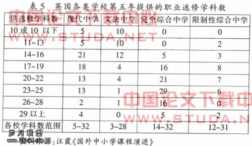 从表中可以看出,虽然英国综合中学的职业课程没有美国多,但综合中学职业选修课的数目在一个年级中就达到了14~32门,比其他类型的中学要多,学生选择的余地也比较大。