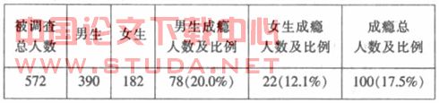 数据处理除去无效问卷,共有572份调查数据有效,其中男生390名,上网成瘾人数为78名,成瘾比例为20.0%,女生182名,上网成瘾人数为22名,成瘾比例为12.1%。上网成瘾总人数为100名,成瘾比例为17.5%。