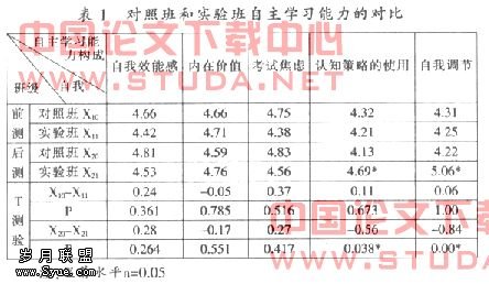 为了了解教学实验前后两个班学生在自主学习能力上的差异性,我们对学生的自主学习能力进行了前后两次问卷调查,使用的是劳和萨齐斯(Rao&Sachs)修改后的中学版MSLQ量表,②从自主学习能力的五个构成维度进行比较。问卷有效回收后,用SPSS10.0软件对所测结果进行数据处理,比较两个独立样本的平均数。③