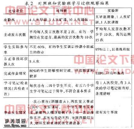 在整个教学过程中,我们对两班的学生在出勤率、主动发言次数、实训课上学生实际参与率、非正常损坏仪器人次、完成作业情况、学习笔记检查情况和事故率方面做了全面观察,结果如表2。