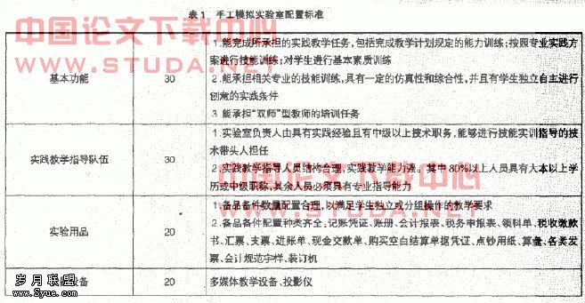 手工模拟实习是模拟企业实际经济业务,采用手工操作方式进行会计核算的一种实习方式。如填制凭证、登记账簿、编制会计报表。它是会计实践教学过程中最基础的环节。手工模拟实验室配置标准见表1: