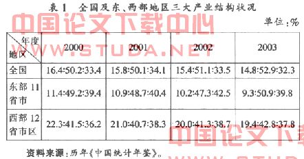 随着我国西部大开发战略的实施和国内外大量资金向西部地区的投入,西部经济社会获得了前所未有的发展机遇。经国家统计局统计,2005年四川省全年生产总值达7385.1亿元,比上年增长12.6%。其中,第一产业增加值1495.7亿元,增长5.8%;第二产业增加值3052.7亿元,增长17.8%;第三产业增加值2836.7亿元,增长10.7%。三大产业对经济增长的贡献率分别为9.1%、57.5%和33.4%。据四川省对2005年国民经济和社会发展的统计,“十五”期间,四川全省进出口总额累计达到279.8亿美元,年均增长25.4%;2005年,全省外贸进出口总额首次突破70亿美元大关,达到79亿美元。全国、东部11个省、市及西部12个省、市、区三大产业结构的变化状况如表1所示。