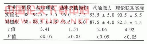 1.2.3 考核 考核内容[3]包括基础理论知识、基本技能操作、沟通能力、理论联系实际。所有结果录入SPSS软件进行数据分析,计量资料采用t检验,以P<0.05为差异有统计学意义。