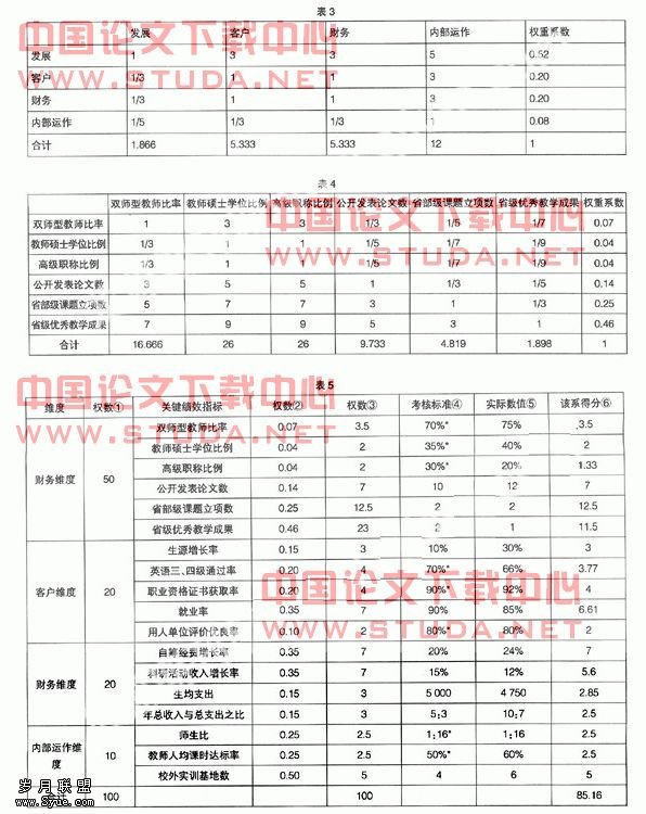 根据以上计算结果,经综合考虑,发展、客户、财务和内部运作的权重系数最终确定为0.50、0.20、0.20、0.10。 2.构建第二层次判断矩阵