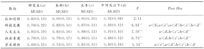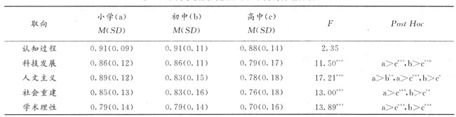 从表4的结果可知,除认知过程取向外,小学、初中和高中教师在科技发展、人文主义、社会重建和学术理性取向上都有极其显著的差异。经多重比较发现,小学教师与高中教师、初中教师与高中教师在科技发展、人文主义、社会重建和学术理性四种取向上都存在着程度不同的显著差异,而小学教师与初中教师只在人文主义取向上表现出非常显著的差异。