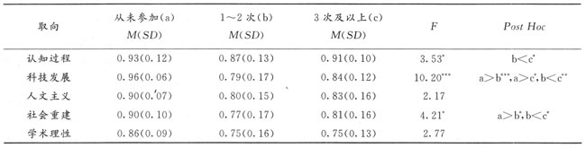 表6的结果显示,不同新课程培训状况的教师在科技发展取向上存在着极其显著的差异,在认知过程和社会重建取向上有显著差异,而在人文主义和学术理性取向上没有显著差异。经多重比较可知,培训过一两次的教师与培训过三次及以上的教师在认知过程、科技发展和社会重建取向上都存在不同程度的显著差异,从未参加新课程培训的教师与培训过一两次的教师在科技发展和社会重建取向上有程度不同的显著差异,而从未参加培训的教师与培训过三次及以上的教师在科技发展取向上有显著性差异。