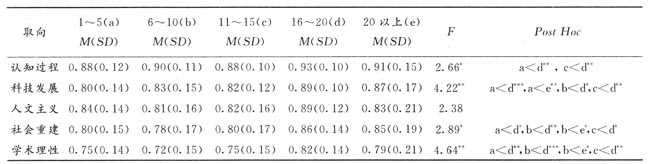 从表3可以看出,不同教龄教师在认知过程和社会重建取向上有显著差异,在科技发展和学术理性取向上有非常显著的差异,而在人文主义取向上没有显著差异。通过LSD事后多重比较可知,1~5年教龄的教师、11~15年教龄的教师分别与16~20年教龄的教师在认知过程、科技发展、社会重建和学术理性四种取向上有程度不同的显著差异,6~10年教龄的教师与16~20年教龄的教师在科技发展、社会重建、学术理性三种取向上有不同程度的显著差异,1~5年教龄的教师与20年以上教龄的教师在科技发展取向上有非常显著的差异,而6~10年教龄的教师与20年以上教龄的教师在社会重建和学术理性取向上有显著差异。
