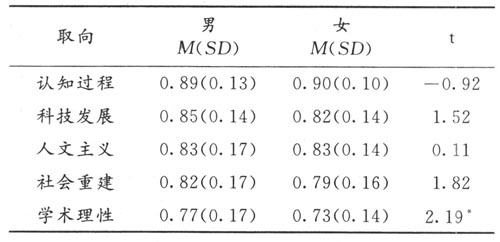 表2 中小学教师课程取向的性别差异分析