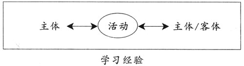 既然学生的学习必须以活动作为存在方式,那么教材内容相应地要转化为活动化内容──学习经验,而不是将孤零零的知识直接传递给学生,在“学生活动与内容”之间必须以学生的活动为中介。学生主体的活动过程实质上也是学生经验的建构过程──思维的逻辑导源于行动的逻辑,行动逻辑向思维逻辑的转化,具体展开为一个内化的过程,内化的涵义则是概念化。学生通过各种形式的活动,进行探究、操作、交往、体悟,将外在的客观对象(学习材料)经主体内化为认知结构,从而主动地建构自己的认知图式。主客相互融合,学习经验便得以生成。通过人的创造性的文化活动,不仅促进了人的心理机能的,在主客相互作用的同时形成了“学习经验”(图1),也将外在的文化知识内化为学生个体的经验。