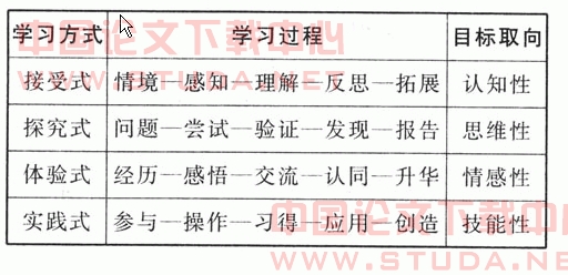 以上根据不同目标要求所选用的学习方式在课堂教学中是经常用到的,新课程提出课程的“三维目标”也必然需要有相应的学习方式来支撑。只有灵活地、有效地运用各种学习方式,才能真正提高教师驾驭课程实施的能力,使教学活动进入到一个较高的境界,很多好的课程理念也就而然地得到落实。值得一提的是,我们需要从课程层面去理解与运用学习方式,不同形态的课程在选择学习方式时会有所侧重。比如,经验性的课堂常常侧重于自主探究、实践体验;而对于学术性较强的课程,接受式仍然是主要的学习方式,尤其是有意义的接受能够使学生融会贯通、举一反三。