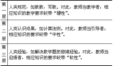 教学的问题在于,人们把工具知识的范围大大扩大了,不论是哪个层次的知识,一律严格要求。如何写景,也作为教条固定下来。这样,学生就丝毫没有时间和空间来进行独立有效的思维。所以,我们的课程,必须小立(这里所说的课程,乃是由教师或课本以教学方式传播给学生的那些内容以及相关编排),而把第二层次的内容作为在教师的支持下学生自己寻找的结果;把第三层次的知识作为学生感悟的结果,把第四层次的知识,一种层次很低的,尽可能地删除。这样,我们就得到了这样的一张表。