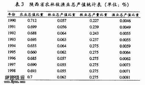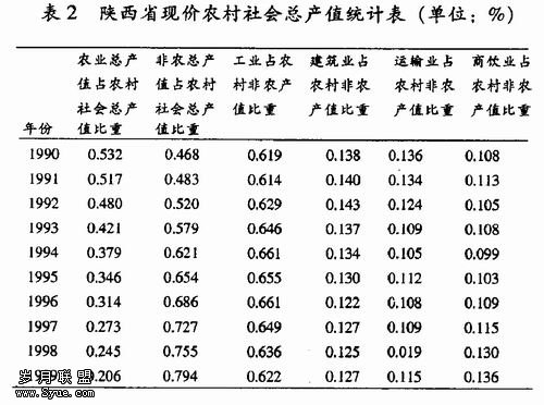 经近10年的统计,在陕西省农村社会总产值中,农业总产值由53%下降为21%,非农业总产值由47%上升到79%。在农村非农产值中,产值占比远远高于建筑、运输、服务业,其份额处在64%左右;而建筑、运输、服务业产值的份额仅处在10%-15%之间(详见表2)。资料表明:陕西农村产业结构趋势基本正常,即第一产业的比重逐渐下降,二、三产业的比重逐步上升;农业与非农业的产值比重相差悬殊。
