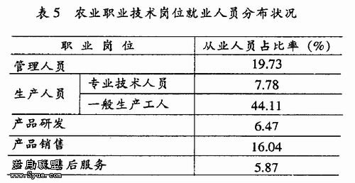 而对目前岗位就业人员分布现状分析,则非生产人员和生产人员所占比重几乎是平分秋色 (详见表5)。生产人员中农业技术人员仅占 7.78%, 而44.11%的生产第一线工人没有经过专业训练。究其原因是目前农业生产中技术含量普通较低,对于一些关键技术,只需要部分甚至极个别掌握该技术的人员承担,而大量的生产人员只需从事一般简单劳动即可。