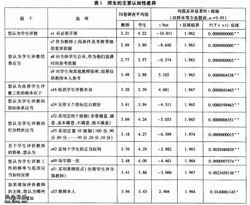 三、研究结果 本次研究从学生样本中共回收有效问卷953份,从教师样本中共回收有效问卷302份。问卷调查结束后,教师和学生样本的全部数据被分别输入 Excel 2000进行统计分析。在分别两个独立样本各个项目描述统计量的基础上,对两个样本的均值按照对应项目逐一进行了差异显著性检验(t检验,双样本等方差假设),结果如下。 (一)师生认知性冲突的主要内容 根据t检验的结果,在以下8个问题中的12个项目上,师生之间存在着显著的认知性差异(详见表1): 从上表看出,教师与学生在学生评教问题上确实存在着许多细节上的分歧与观点差异。表中所列出的条目都达到了统计学意义上的差异显著性水平,有些差异还极其显著(在t检验数据中,P值上标有“,”,表示显著性水平P≤0.05;P值上标有“* *”,表示显著性水平P≤0.01,即有99%以上的把握认为二者的差异是显著的而非偶然的)。 将上述列表绘制成师生主要认知性差异折线对比图(见图1),可以更为直观地看出二者之间的差异。