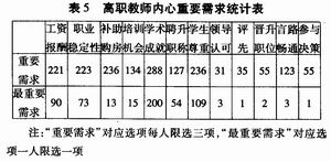 由表4可知,最满意的需求选择依次为:职业稳定性、培训机会、学生尊重、聘升职称、学术成就、参与决策、言路畅通、领导认可、评为先进、工资报酬、晋升职位、补助购房。基本满意的需求情况为:职业稳定性、学生尊重;其余都很低,大部分在30%以下,其中选择率低的有参与决策、学术成就、培训机会、晋升职位、聘升职称、工资报酬、补助购房。 没有满足的需求选择依次为:评先、工资报酬、培训机会、职业稳定性、学术成就、补助购房、聘升职称、学生尊重、参与决策、领导认可、晋升职位、言路畅通。 最让人不满意的需求选择依次为:学术成就、工资报酬、补助购房、培训机会、言路畅通、聘升职称、参与决策、领导认可、评为先进、学生尊重、晋升职位、职业稳定性。 可见,让高职教师满意的是职业稳定性、学生尊重,以及勉强满意的聘升职称;让高职教师最不满意的是:学术成就、补助购房、工资报酬以及领导的态度(沟通与认可)、培训成长的机会等。 (二)高职教师的需求偏好情况(见表5)