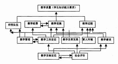 硬件,如实验实训基地、图书馆、场馆、教学手段以及职业所独有的技能鉴定站(所)等,其优劣不但对学生的职业能力和职业素质产生直接影响,也对教师的知识结构和知识更新不断产生影响。教学经费是开展教学活动的保证,实验实训基地建设、师资进修培训、教学手段更新均离不开经费的保证,而且经费投入越大,教学质量越有保证,这已被实践所证明。教学过程是直接面对学生所开展的活动,直接影响到学生的能力素质,教学内容组织合理,教学环节设计,体现以能力为中心的教学特点是提高教学质量的重要环节。 2.基础指标。包括教学管理、教学工作定位、教学改革发展、育人环境和教学建设五个指标,与教学质量密切相关,他们对教学设施,教学经费和教学过程等产生直接影响,对教师及学生能力素质产生间接影响。教学管理是教学质量提高环节中的重要措施,科学有效的管理机制,能对质量环节中出现的问题进行及时反馈和调控,不断优化教学措施和过程。教学工作定位准确与否,是学校办学理念正确与否的标准,只有确立教学工作的中心地位,重视教学工作,才能使学校的一切工作围绕教学工作展开,保证教学质量的不断提升。教学改革发展、育人环境和教学建设三个指标对教学设施和教学过程影响明显,重视教学改革发展和教学建设,才能重视教学设施的投入;重视育人环境的建设,才能重视教学过程的控制,从而为提高学生的能力素质创造良好氛围。 3.相关指标.包括教学目标定位和社会评价,是校内和校外对教学质量的基本定位。教学目标定位反映了学校对人才培养规格的认识,社会评价则反映了社会对学校教育教学质量的认可程度,二者均对学校的教学工作定位、教学改革发展产生直接影响,从而间接地影响教学质量。通过对教学质量评价指标的相关性分析,我们清楚了各指标在教育教学质量评价中的地位和作用,有助于我们在教学质量控制过程中,有针对性地开展工作,提高工作效率,不断提高职教育教学质量。 [][1]张永玲,盂庆莲,于爱芹.建立学校内部质量保障体系的探索门]冲国高等教育评估,2001,(2).[2]赵居礼等.高职高专教育教学质量监控与教学评价体系的研究与实践[M]。北京:高等教育出版社,2,004年6月第一版.[3]汪应洛.系统工程[M].北京:机械出版社,1999年9月第二版.