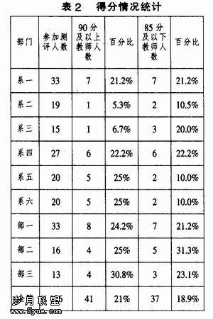 (1)从统计结果来看,得分在职人员85-95分之间的教师占总教师数的80%,全院平均分为87,得分呈正态分布,说明统计结果基本符合统计,见表2。