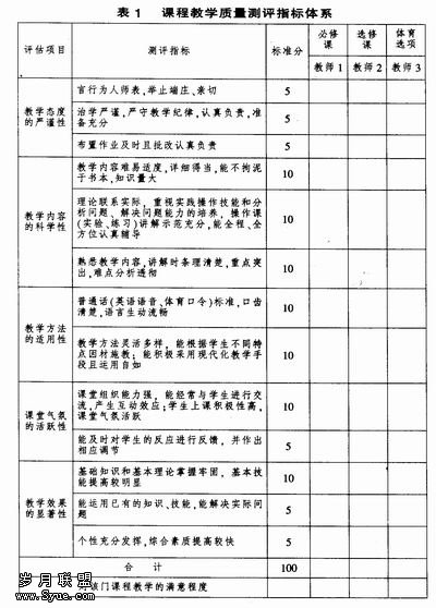 评价指标体系的制定是评价工作成败的关键,只有科学、合理的指标才能正确诊断、评价课堂教学质量。建立合理的课堂教学质量评价体系,应根据教育教学理论、当今课堂教学的特点以及对教师课堂教学工作的基本要求并充分结合本校的特点。由于课堂教学形式是多样的,教师是根据学生、课程内容、教学条件及自己的知识准备等特点采用不同的教学方式,应针对不同的课程和不同的教学形式,设计出不同的评价指标体系。此外,指标体系还应简明,易于操作以便于统计分析。随着指标体系的不断完善,应逐步加大学生评教结果的使用力度,充分发挥学生评教的作用。