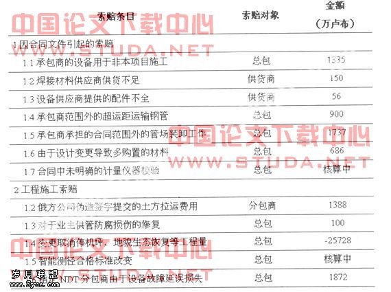 在施工过程中,由于业主增减新的工作、改换材料、暂停或加速施工等变更引起新的施工费用,或需要延长工期等,所有这些情况,承包商都可提出索赔要求。在俄罗斯管道建设项目中由于水源的限制,在进行水压试验、智能测径和排水的时候,将临近段落由俄罗斯“东方公司”负责施工的30公里管线纳入我们的系统一同完成,这部分属于增加的合同外工作量。