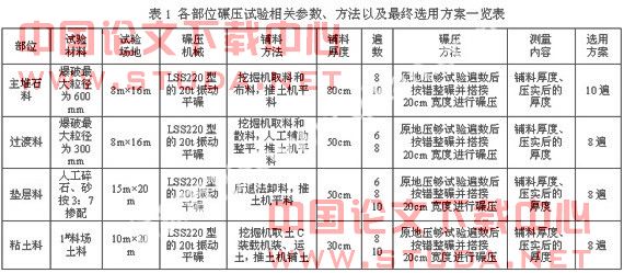 垫层料使用Dmax<80mm和40mm的机械轧制碎石和机制砂掺配,其体积比例为3:7;选取铺料厚度50cm、LSS220型的20t振动平碾碾压8遍的施工参数。