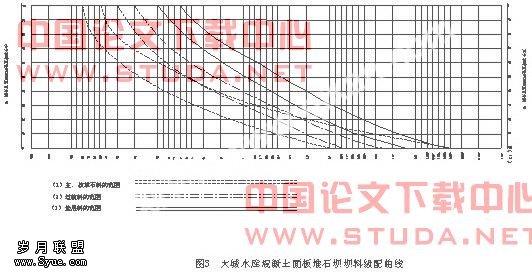 (2)、施工参数:控制最大粒径80~100mm(如图3 大城水库砼面板堆石坝坝料级配曲线图);13.5t振动平碾(施工中根据实际情况进行调整),振动碾压6~8遍;铺料厚度50cm。