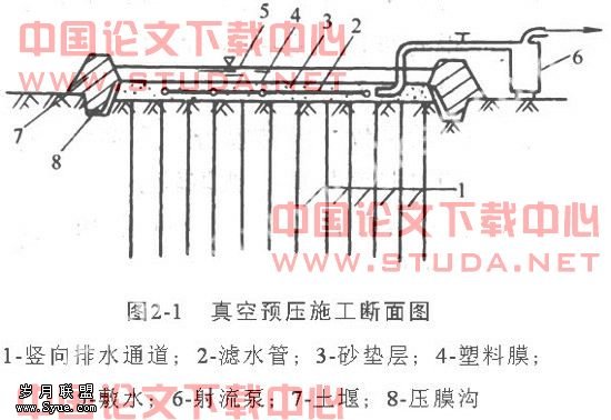 真空预压法是先在需加固的软土地基表面铺设一层透水砂垫层或砂砾层,再在其上覆盖一层不透气的塑料薄膜或橡胶布,四周密封好与大气隔绝,在砂垫层内埋设渗水管道,然后与真空泵连通进行抽气,使透水材料保持较高的真空度,在土的孔隙水中产生负的孔隙水压力,将土中孔隙水和空气逐渐吸出,从而使土体固结。图2-1是典型真空预压施工断面图。