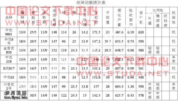 (四)综合分析:根据田间记录统计表可知,中优9801株型适中,叶色深绿,抽穗整齐一致,产量最高,抗病性强,可大面积种植;华优6号株型适中,叶色淡绿,整齐度中等,抗病性较强,产量在本次试验中位居第二;金香优830株型松散,叶色淡绿,轻感叶瘟、穗颈瘟,抗倒伏性强;中优218株型紧凑适中,剑叶直立,叶色深绿,生长整齐一致,抗叶瘟、穗颈瘟,后期早衰易倒伏;B优817株型紧凑,剑顺直立,叶色深绿,抽穗整齐,较抗叶瘟、穗颈瘟,抗倒伏性强;中优63株型适中,叶色深绿,生长整齐,抗叶瘟、穗颈瘟,抗倒伏性强;川香优2号株型适中,剑叶宽大,生长整齐,轻感叶瘟、穗颈瘟,后期早衰易倒伏;D优多系一号株型松散,叶片宽大,生长整齐,轻感叶瘟、穗颈瘟,抗倒伏性强。