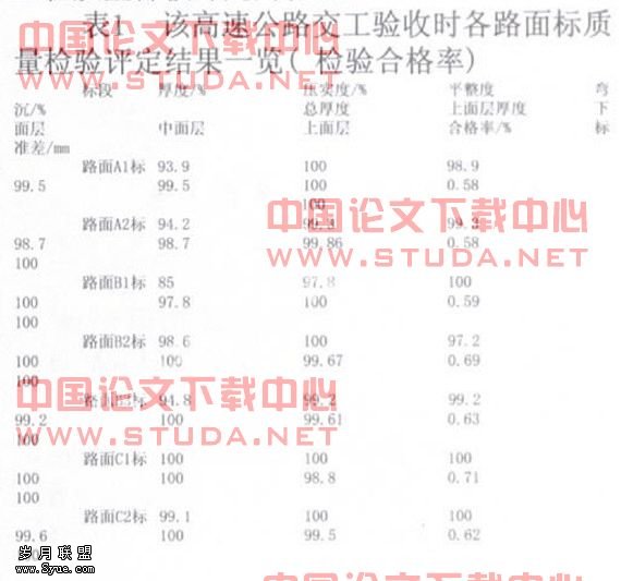 该一级公路从通车至今,已经两年有多了,从通车开始交通量就较大,刚通车时昼夜交通量就达5辆辆,目前已经近1万辆,重车比例占2成左右。沥青路面经过了高温与多雨的考验,目前又是高温多雨的季节,从该公路上实驾车行走与质保期维修养护的情况来看,路面因离析出现水毁坑槽的现象较少,基本没有车辙病害,全线行车舒适、平整度好,路面的构造深度也满足要求。