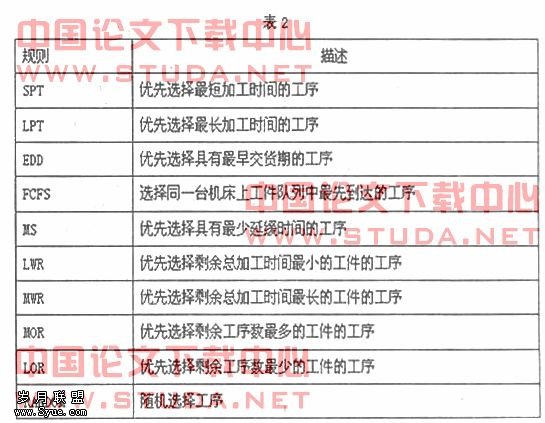王龙生等的《一种新型的作业车间调度算法的研究与实现》一文在讨论了车间作业调度与控制的已有的方法和策略基础上结合我国的现有情况,开发了采用分层分布式控制方式和相对剩余加工最大的优先分配原则的新型作业车间调度与控制原型系统。其中剩余加工最大的优先分配原则是作者提出的一种新型的优先分派规则。优先分派规则就如同计算机操作系统中的作业管理中有先来先服务算法、最短作业优先算法、优先级算法等等。已有的优先分派规则有: