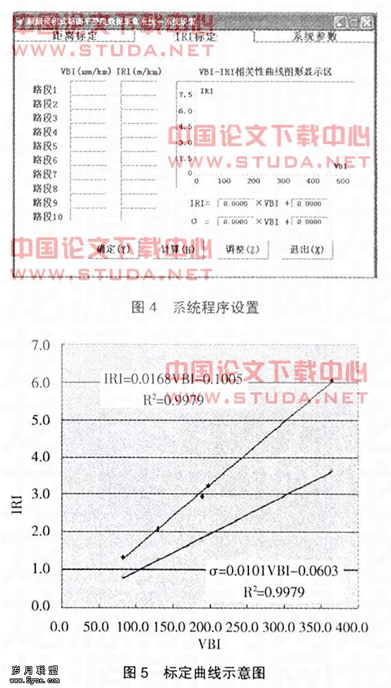 (3)连续式平整度仪标定步骤:①按现行操作规程用连续式平整度仪沿选择的每个路段全程连续测量平整度3~5次,取其平均值作为该路段的测试结果(以标准差表示)。②按2.4的步骤,用车载式颠簸累积仪沿各个路段进行测量,重复3~5次后,取其各次颠簸累积值的平均值作为该路段的测试结果,与平整度仪的各段测试结果相对应。标定时的测试车速应在30km/h~50km/h范围内选用一种或两种稳定的车速分别进行,记录车速及搭载量,以后测试时的情况应与标定时的相同。③整理相关关系。