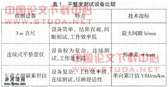 路面平整度的检测设备分为断面类和反应类两种。断面类是测定路表面凹凸情况,常用的仪器有3m直尺,连续式平整度仪;反应类是测定由于路表面凹凸不平引起的车辆颠簸情况,其反应的是舒适性能指标。表1为两种检测设备的比较。为了更加可靠地反映路面在正常运营过程中平整度情况,目前高速公路竣工检测常采用车载式颠簸累积仪,并通过换算求出国际平整度指数IRI,作为竣工验收的依据。