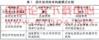 信用体系的构建模式通常依据征信机构的产生和发展背景来划分,从国际上各个国家信片J体系构建模式类型上看,目前主要有两种选择:一种是政府主导的社会信用体系模式,即征信机构由政府组织设立,主要由中央银行、监管机构和行业协会组成,征信机构和资信评价机构都是非营利性的,由政府统一实施监管;另一种是市场主导的社会信用体系模式,在市场化模式下,不仅具备了较为完善的信用体系和政府监管体系,而且与之相伴形成了独立、客观、公正的,按照制度方式建立,并依据市场化原则运作的征信服务机构(见表1)。