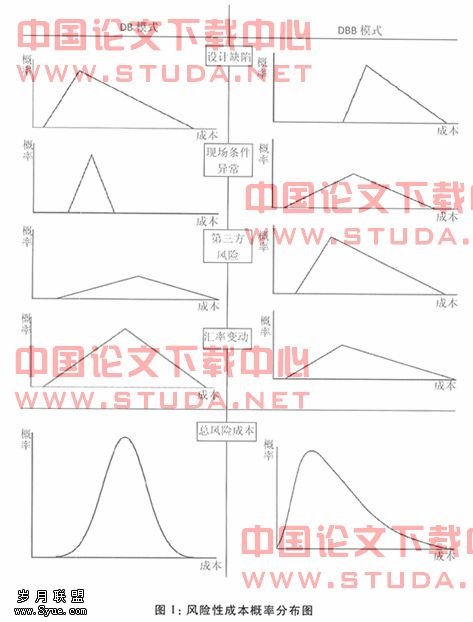 概率分布的表示方法有多种,本方法采用的是三角型分布,通过统计最大、最小及最可能的值得出。三角型分布是最简单常用的概率分布,同时还解决了不同风险下风险性成本的概率分布不同而导致的难以求解总的概率分布的问题。最后,根据每个风险因素的概率分布,对风险因素进行随机模拟,进而求得总的风险成本概率分布图,如上图1所示。业主最终通过比较不同工程项目交易方式对成本的影响,选择最适合的交易方式。