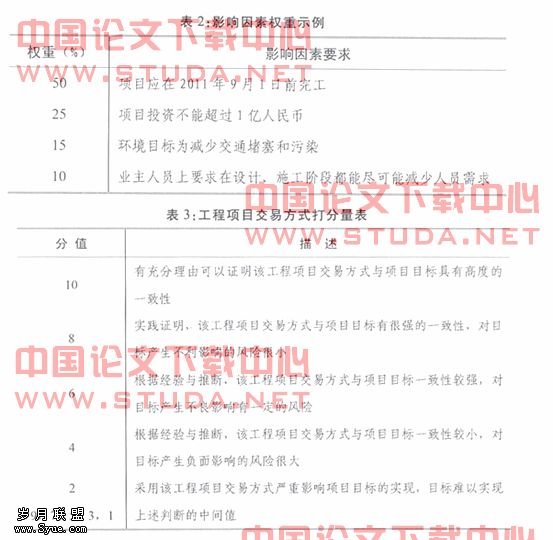 然后对备选的工程项目交易方式进行打分。打分可以通过小组讨论,参照表4给出的描述赋予相应的分值。