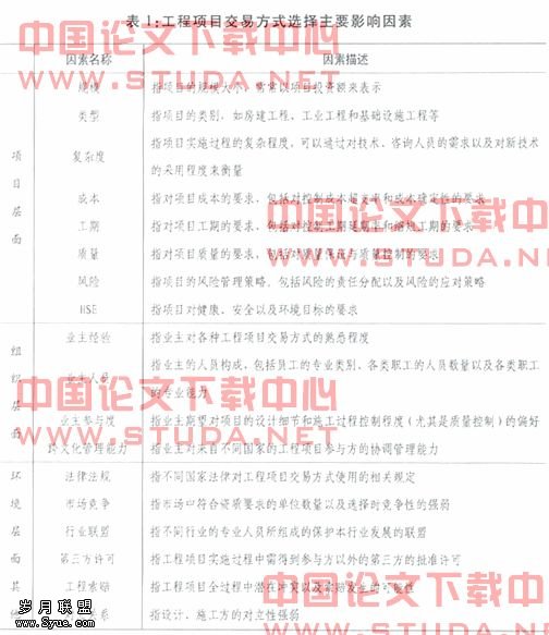 虑),如表2所示。就这些因素对工程项目交易方式的适用程度进行评价,一般分为高、中、低三个等级,并且可以在备注栏中注明原因。
