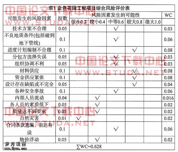 但由于资料的不完整、项目的复杂性、环境的多变性以及人们认识的局限性都会使人们在评估和分析项目风险时出现一些难度,金色花园工程项目风险评估就遇到这样的问题,风险发生的损失值无法精确量化,只能评估出项目的综合风险值,估计出大致的风险度。 3. 金色花园工程项目风险控制