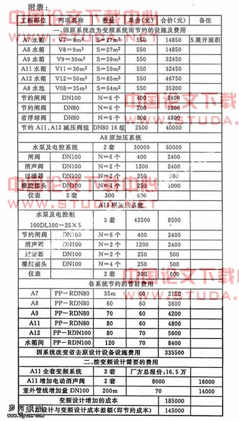 A7、A8、A9、A11、A12共采用两套变频系统供水,可节约大量设备机房、地下水池、屋顶水箱需用的建筑空间,降低因设置水箱产生的建筑结构成本。提高了原设计设施设备的品质,增加了供水设备的可靠性及耐久性,从而增加该系统的稳定性。附表所列是除去节约的建筑结构成本外,两种方式供水费用对比明细。