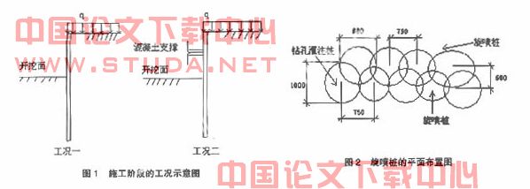 本工程的旋喷桩设计为双排,直径为Φ800mm,孔距为750mm,排距为600mm,水泥渗量为15%。桩深入到基坑底面4m下,即桩长12.3m。旋喷桩的平面布置图如图2。