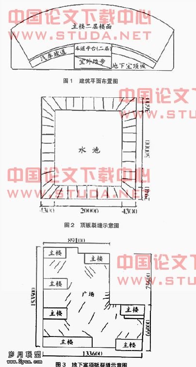 大底板多塔楼高层建筑的地下室顶板平面尺寸一般都很大、各边长度超长,温度变化引起的伸缩与混凝土自身收缩值均较大。塔楼大量的混凝土墙柱与剪力墙是结构中重要的抗侧力构件,它的存在大大提高了结构的抗侧移能力,加大对顶板变形的约束。由于顶板受到周边塔楼结构的强约束,而中间广场部位有一个较大的空间,只受到地下室墙柱的弱约束,因此顶板周边受到的约束远远大于中央部位受到的约束,周边受到的应力也远远大于中央部位。由于顶板在塔楼附近应力集中,因此裂缝首先在这里产生。由于平面尺寸大、结构超长,顶板其它部位也逐渐有裂缝产生,顶板中心由于约束很弱,一般无裂缝产生。塔楼部位的顶板受到地下室与上部结构的约束均较大,而自身的梁板跨度均较小且梁断面较大、刚度较好,一般不会出现裂缝。