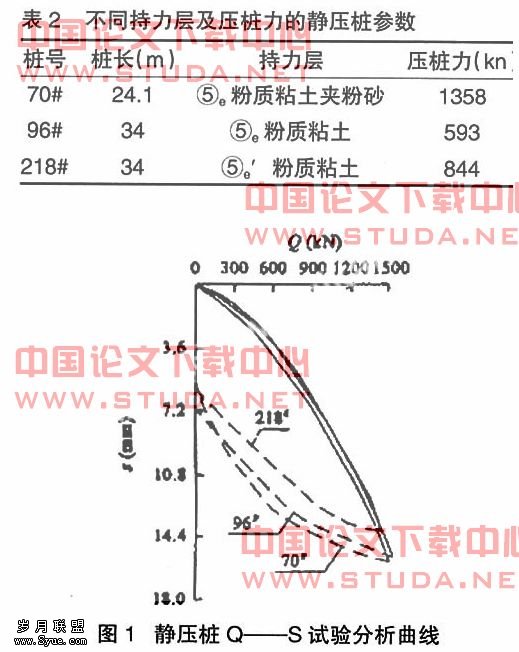本工程打桩结束后,从现场选取3根不同持力层及压桩力(见表2)的工程桩进行抗压静载试验,最大检测荷载取二倍单桩承载力特征值,约1500kN。根据Q--S试验曲线分析,单桩的抗压极限承载力均达到1500kN,分析曲线见图1,同时,抽取13根不同压桩力的桩进行高应变动测,极限承载力均达到设计要求。