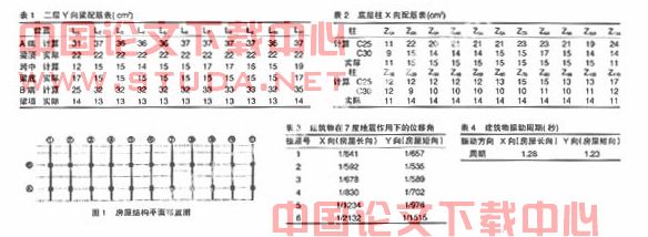 建筑物在7度地震作用下的最大位移角及振动周期见表6,二层Y向粱及底层柱X向配筋情况见表7、表8 ( 表中“-”为剪力墙布置处的梁柱配筋未写出) 。