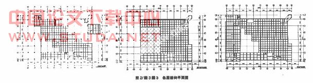 该建筑平面长度为81.9m、宽度57.4m,总高度19.5m;地下室层高4.5m,1~4轴为五层(行政区域)、各层高3.8m,4~12轴为三层(办事区域)、一层高5.6m、二、三层高5.4m;4轴两侧形成错层平面;基本柱网1~4轴为8.1mx8.4m、其余均8.4mx8.4m。各层结构平面见图2、图3、图4。