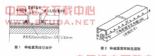 人行通道及挡墙设计一般有两种情况1)按中南地区通用标准图集《平屋面》(98ZJ201)的要求做,如图1所示。砖砌挡墙,挡墙墙身高度要比种植介质面高100mm。距挡墙底部高100mm处按设计或标准图集留设泄水孔。2)采用预制槽型板作为分区挡墙和走道板,如图2所示。