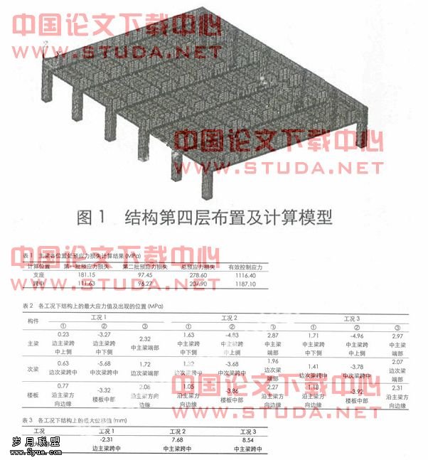 通过对该预应力混凝土楼盖结构的分析,得到了各工况下结构第四层主梁、次梁和楼板上的应力分布情况,其最大拉应力、最大压应力、最大剪应力值及所出现的位置如表2所示。