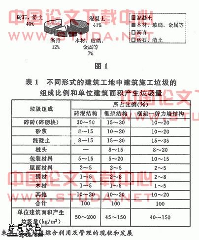 调查表明,建筑施工垃圾主要由碎砖、混凝土、砂浆、桩头、包装材料等组成,约占建筑垃圾总量的80%。表1列出了不同结构形式的建筑工地中建筑施工垃圾的组成比例和单位建筑面积产生垃圾量。?