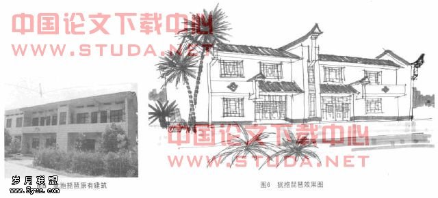 只对立面的主要部位如大门、窗套、护窗、山墙等进行重点处理(图5,6),改造后的仿传统民居花格窗,垂花窗,使整个住宅具有浓郁的乡土风情,可以大量使用,但形式需因地制宜,有所变化。