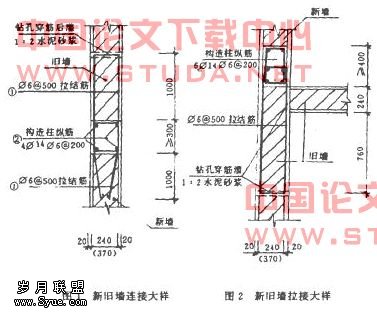 3.6新旧墙交接处的连接牢靠与否将影响房屋的开裂等。通过对几百套改造住宅的观测,新旧墙交接处基本无明显裂缝,这里提供两个节点大样,供大家。
