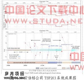 举例说明如下:图(11)是TSP203仪器预报成果图中的一部分,图中上半部分三项参数的直方图,由上而下为岩体分段的纵、横波速度参数值;岩体的密度值;和岩体的弹性模量值。图的下半部分为反射界面的分布图。以图中的反射界面线与隧道里程线的交点为序,统计反射界面与隧道轴线的夹角,汇总成表1。