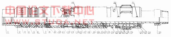 1-上接头 2-调节环 3-“”型圈 4-长胶筒 5-隔环 6--短胶筒 7-轨道中心管 8-楔形体 9-档环 10、12、19、30、31-防松螺钉 11-楔形体 13-限位螺钉 14-卡瓦 15-大卡瓦档块 16-小卡瓦档块 17-固定螺钉 18-连接环 20-护罩 21-扶正体 22锁环套 23 档环套 24-锁球 25-顶套 26-扶正体 27、32-限位压环 28-摩擦环 29-弹簧 33-转环 34-轨道销钉 35-下接头